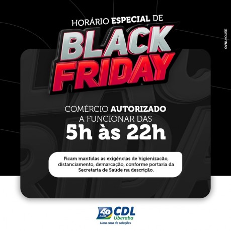 Nesta sexta-feira (27), em caráter excepcional e em decorrência da Black Friday, o horário de funcionamento/atendimento nos estabelecimentos comerciais será das 5 às 22 horas, respeitando as medidas impostas pelo decreto 6305/2020.